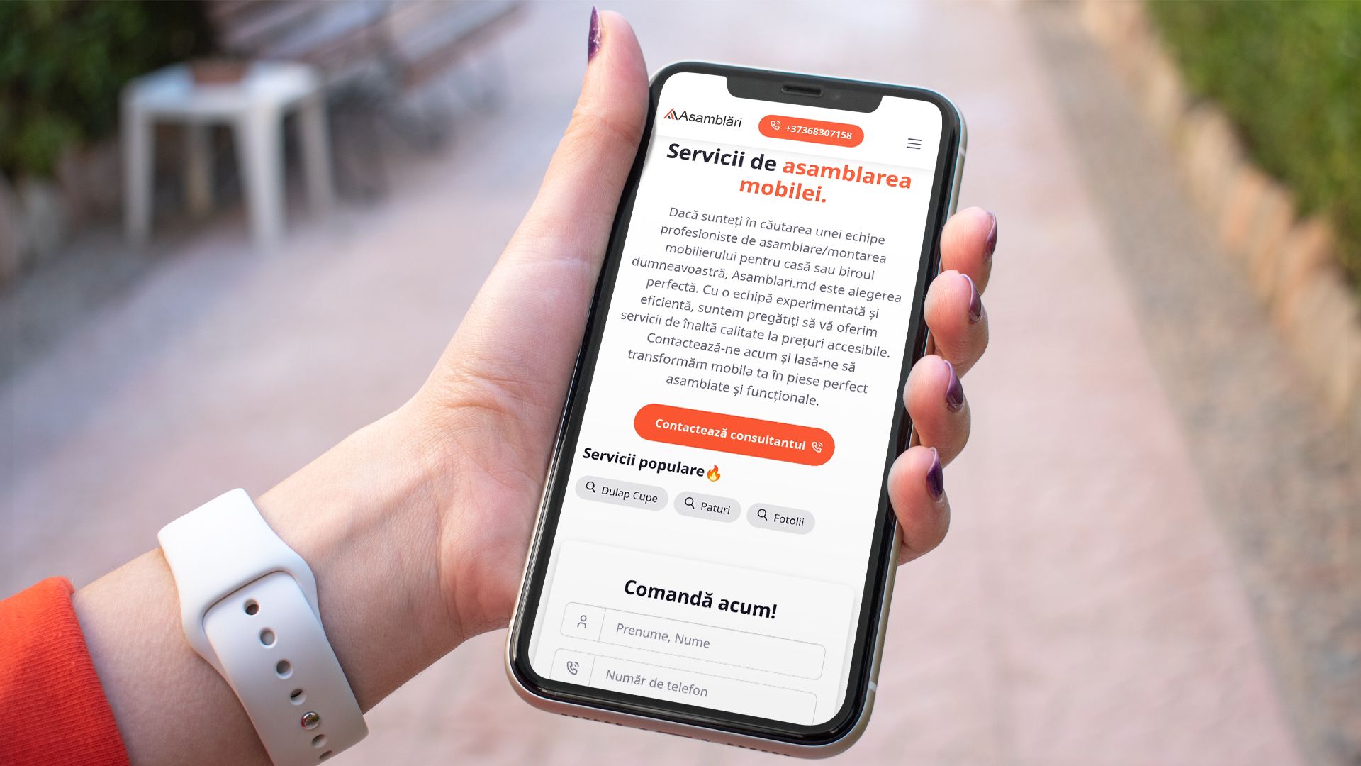 Prezentarea detaliată a serviciilor oferite, inclusiv tipurile de mobilier asamblate și metodele de contact pentru programări.